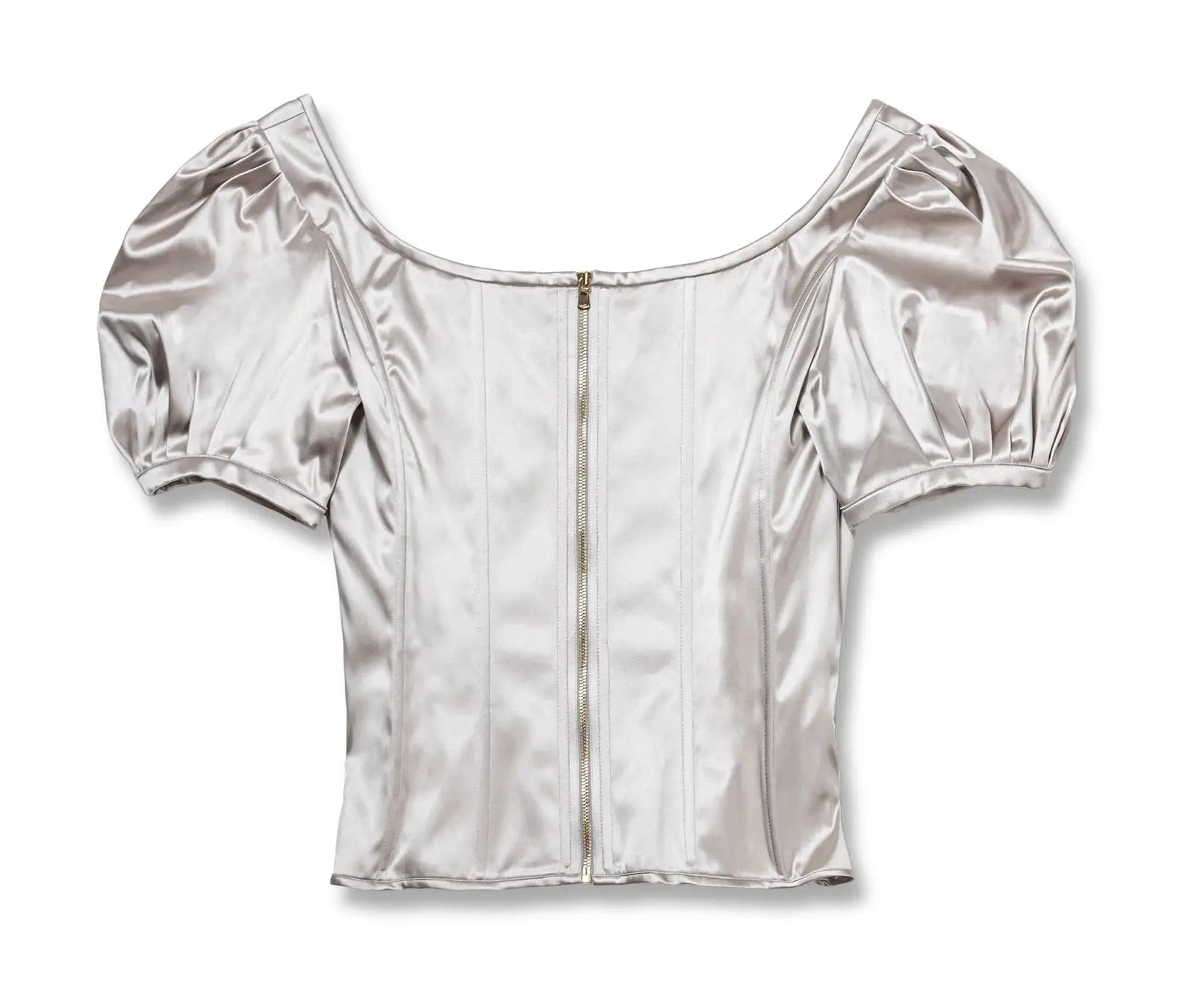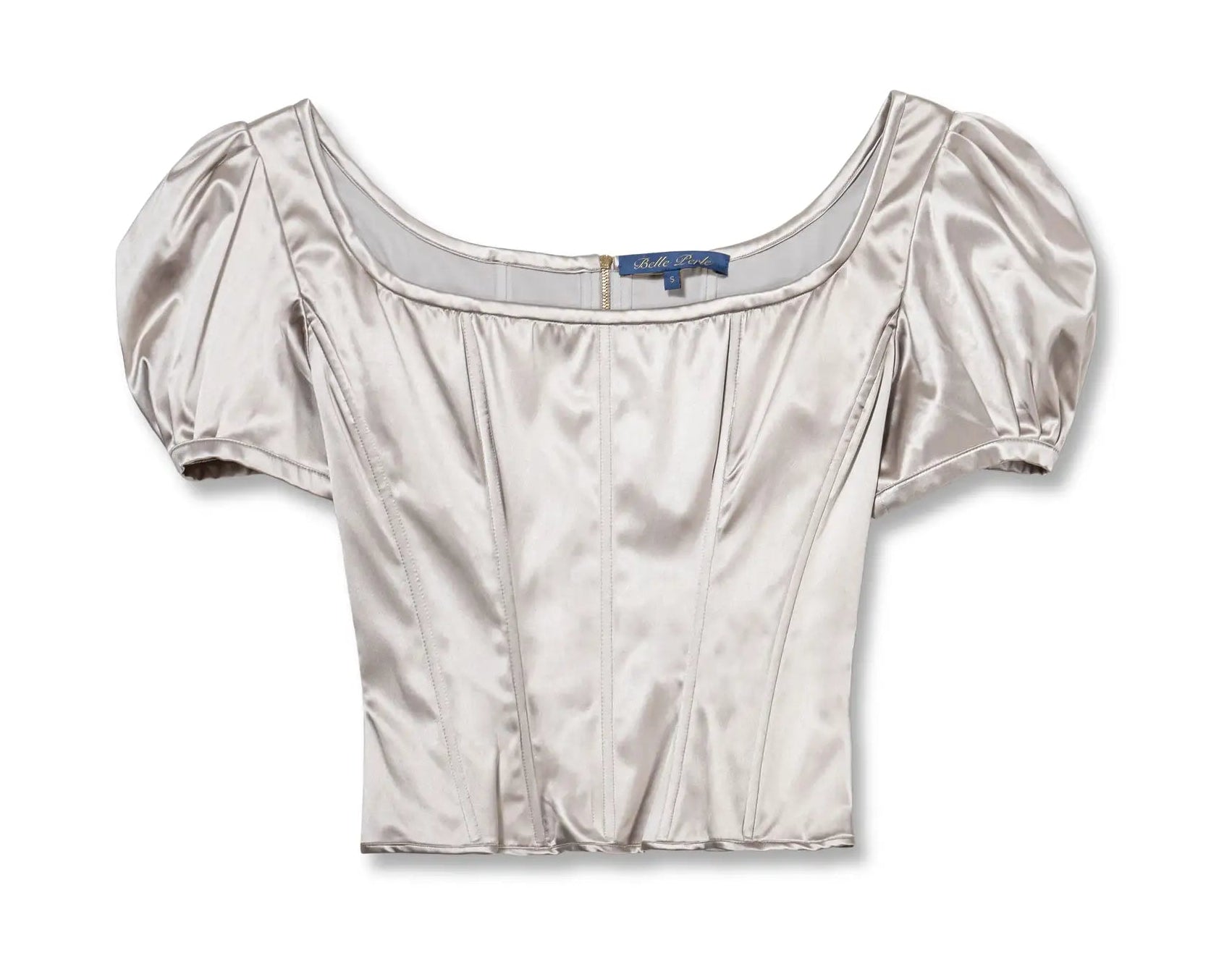 Inspired by 16th-century corsets, this off-the-shoulder design with puffed sleeves is reimagined as a modern bustier. Its sculpted fit supports and shapes the body from every angle, while the pearly satin finish adds timeless elegance and subtle allure, embodying Belle Perle’s signature style.
